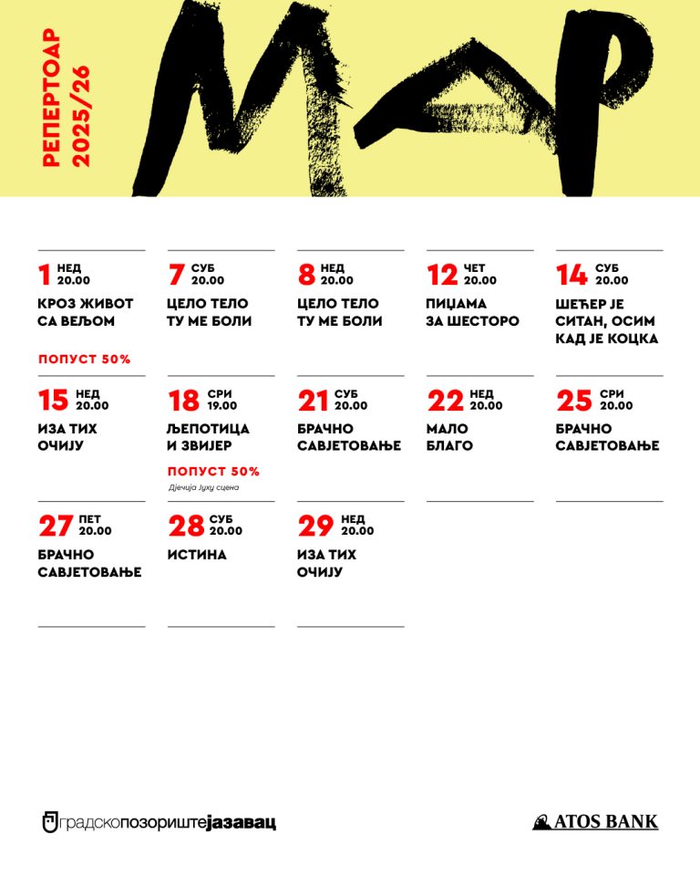 Sve ljubitelje pozorišta i u martu u Gradskom pozorištu „Jazavac“ očekuje zanimljiv i bogat repertoar.