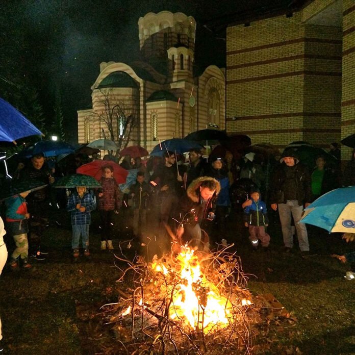 U porti Crkve Svete Trojice u Banjaluci večeras je obavljeno paljenje badnjaka u prisustvu velikog broja vjernika.