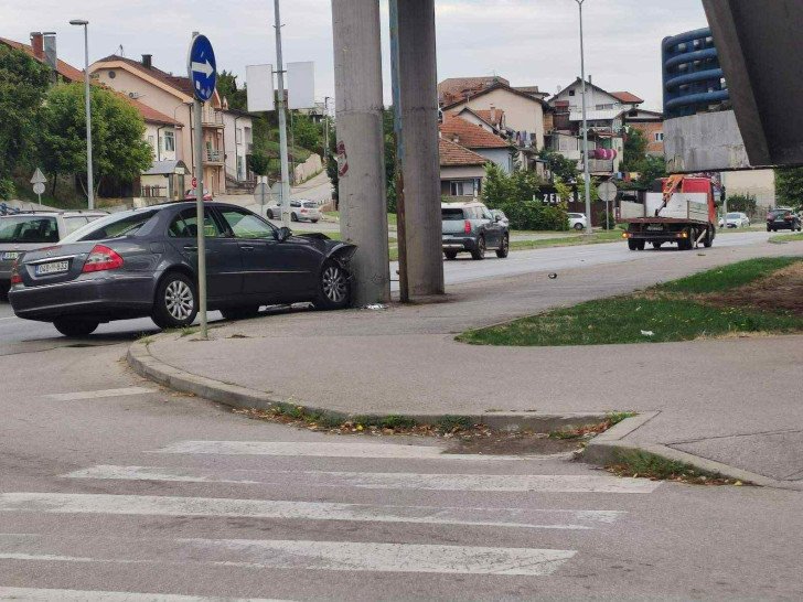 Neobična saobraćajna nezgoda dogodila se danas na zapadom trnazitu , kada je putnički automobil “Mercedes” završio zakucan u stub nadvožnjaka