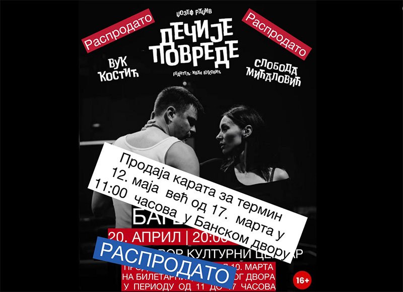 -Zadovoljstvo nam je što vlada ogromno interesovanje za predstavu „Dečije povrede“ i što publika želi ponovo da vidi naše prijatelje Slobodu Mićalović i Vuka Kostića u Banjaluci. Danas su sve karte rasprodate za pola sata i zbog mnogih ljudi koji su bili razočarani jer nisu uspjeli da kupe ulaznicu otvorili smo novi termin 12. maja. Prodaja ulaznica biće 17.marta i to od 11 do 17 časova, rekao je Aleksandar Pejaković, reditelj Studentskog pozorišta.